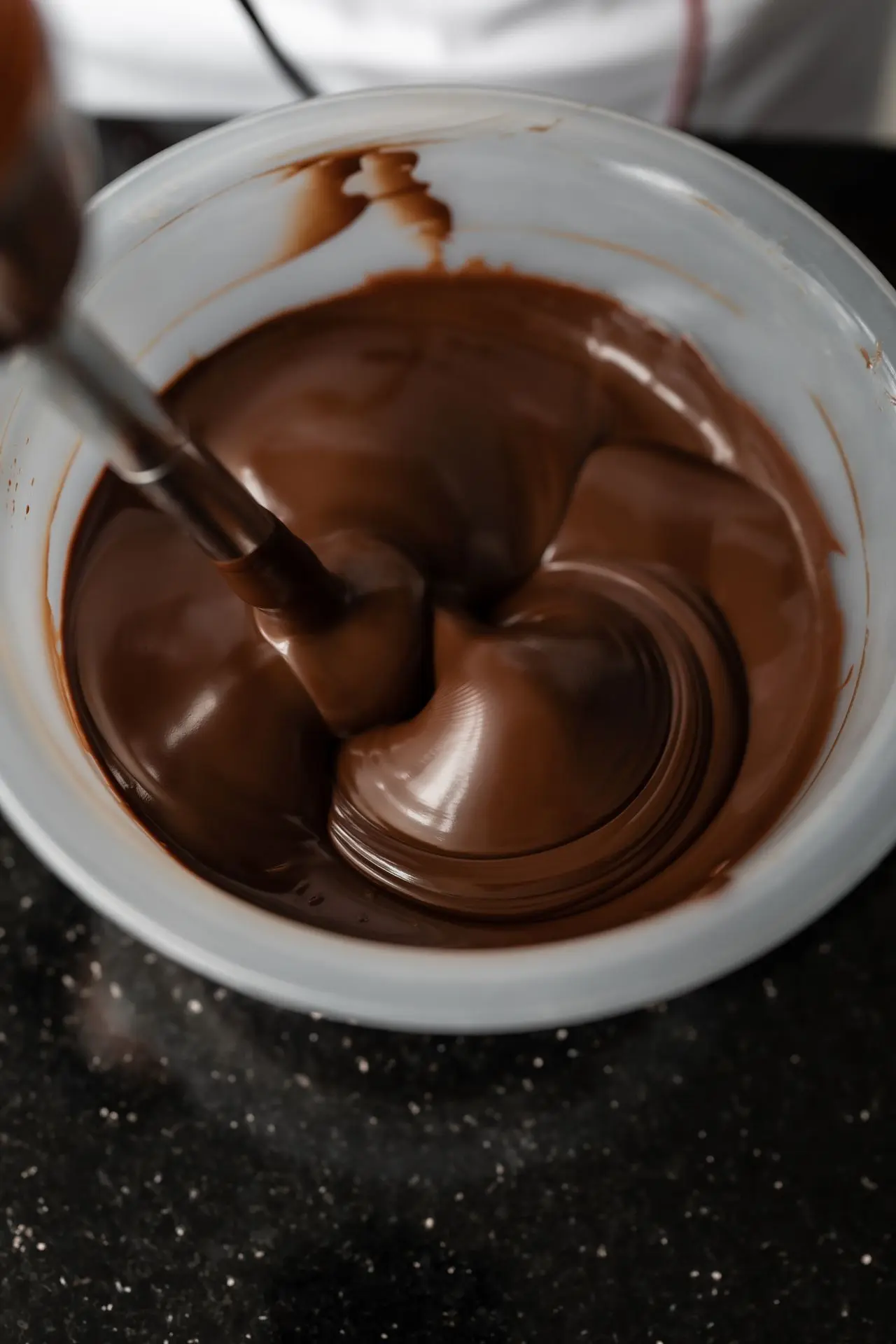 Hervir la crema de leche junto con la glucosa. Agregar una pequeña parte de ese líquido sobre el chocolate previamente fundido. Mover y mezclar con espátula de silicona, creando una emulsión.